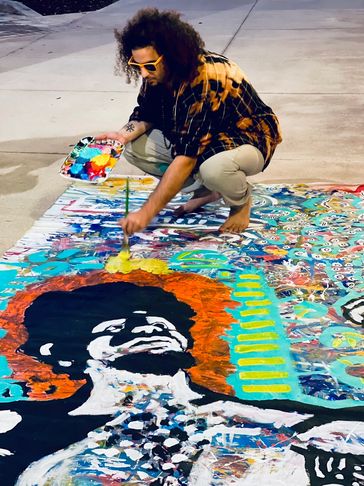 "I possess an investigative interest in mark-making with a love of exploring swashes of bold colors. I am a live painting performer, favoring synesthetic performances done in public or with an audience."